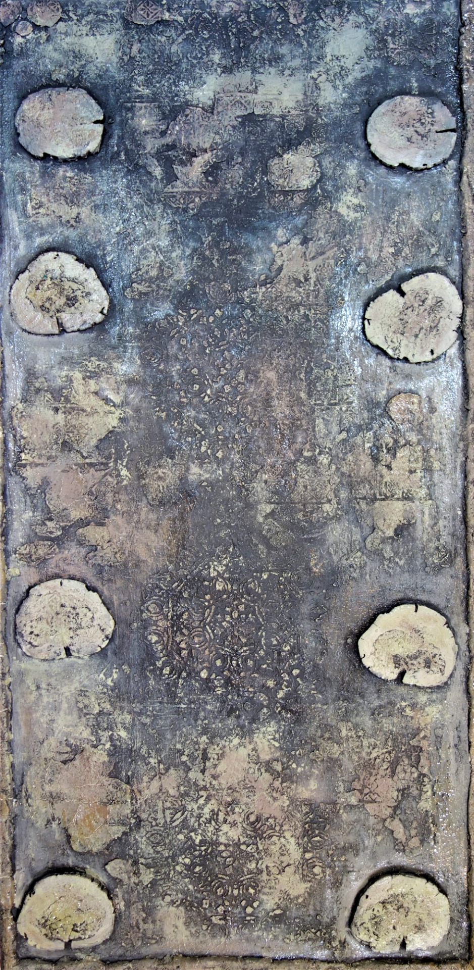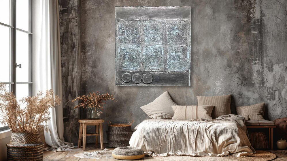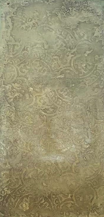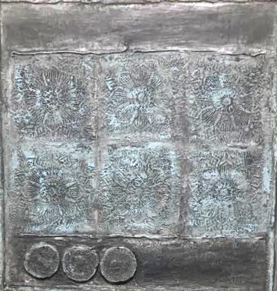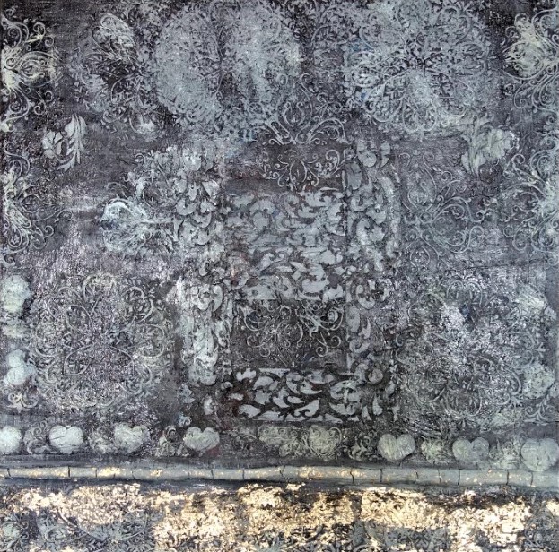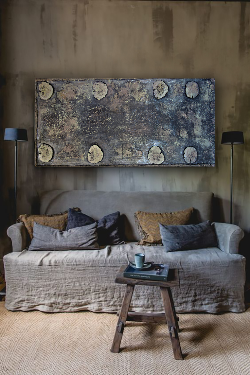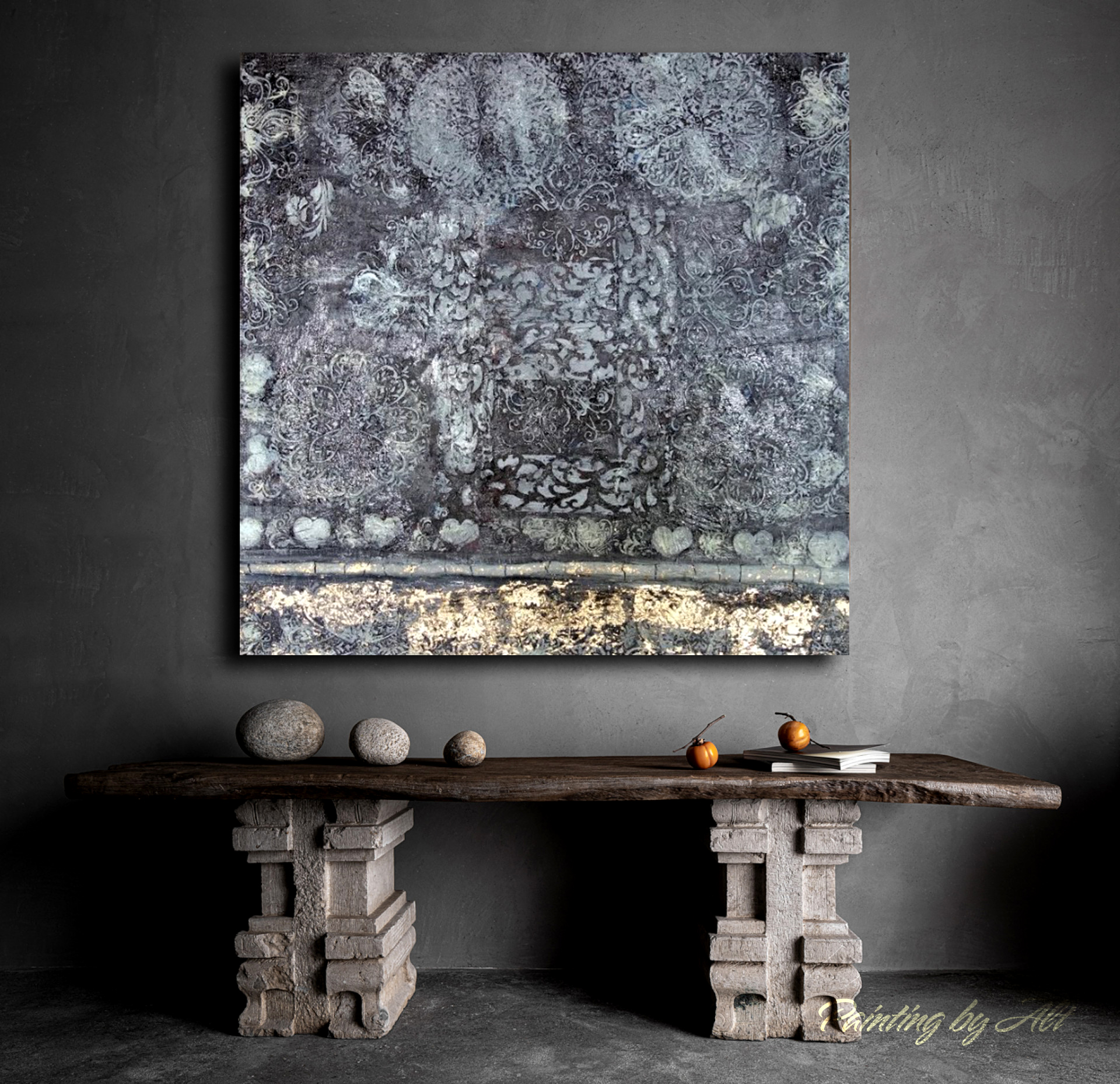 Robustes ländliches Gemälde, völlig versteinert in versschiedenen rustikalen Grautönen kombiniert mit Goldtönen. Größe 100x100x4cm. Preis €536,-