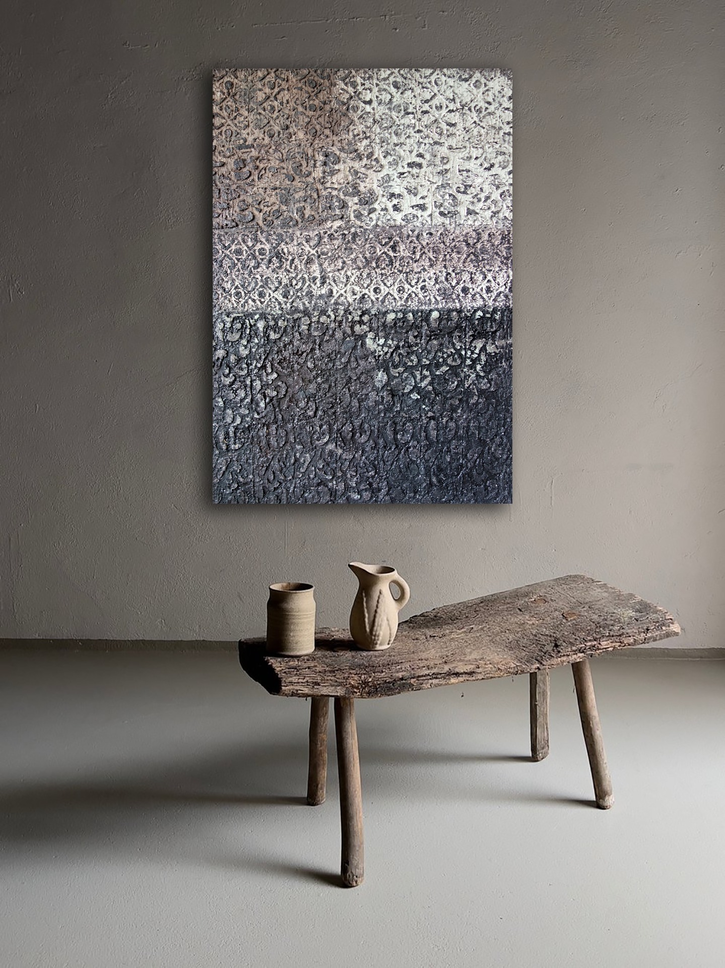 Rustikales ländliches Gemälde in verschiedenen ländlichen Farbtönen wie Hellgrau, Anthrazit, Sand, Schwarz. Dieses abstrakte Gemälde kann auf verschiedene Arten platziert werden. Größe 70x100x1,5cm. Preis: €389,-