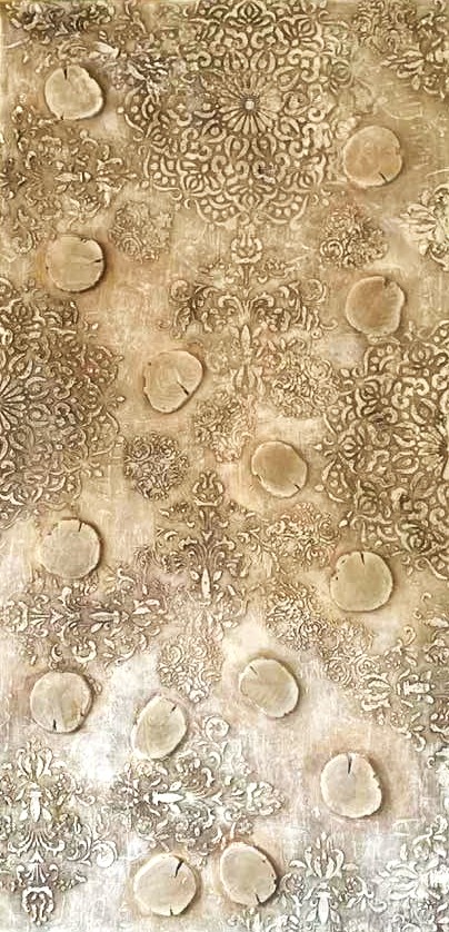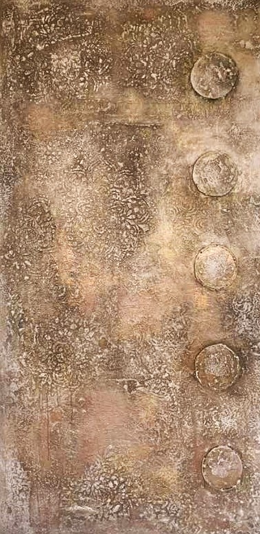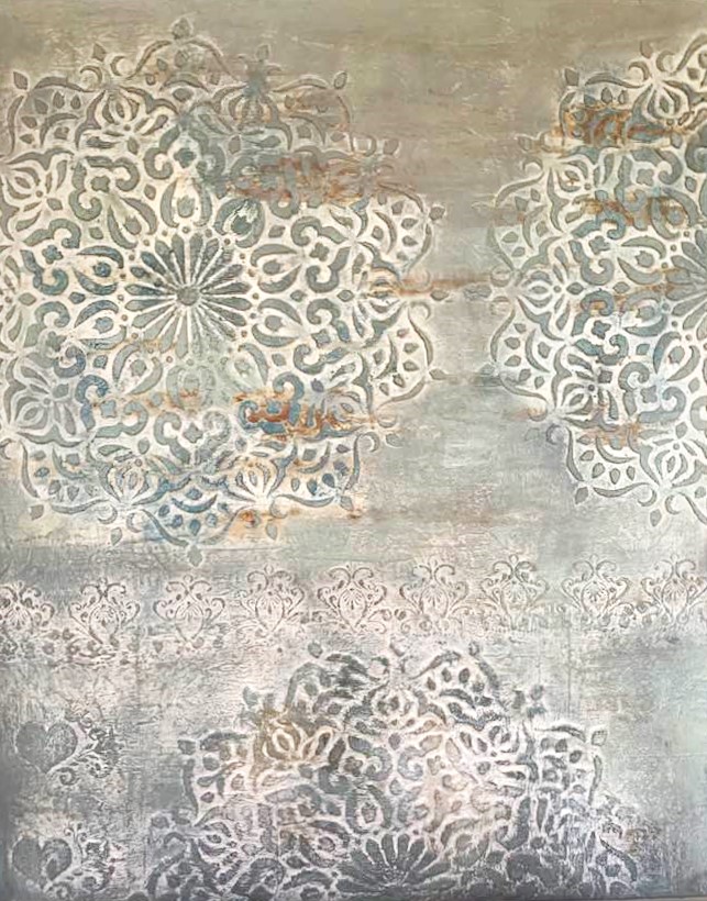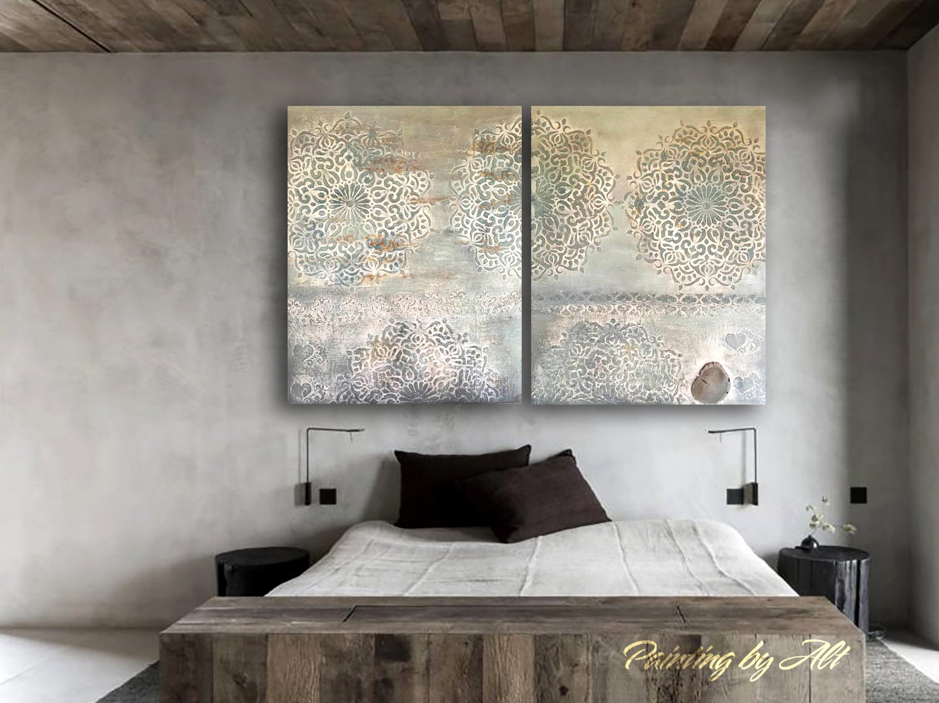 Zwei Coole ländliche versteinerte Gemälde, mit alte mandala Textur in Grau/Rost/Bege Farbton. Eine schöne Ergänzung für Ihr Interierur! Preis: €586,-